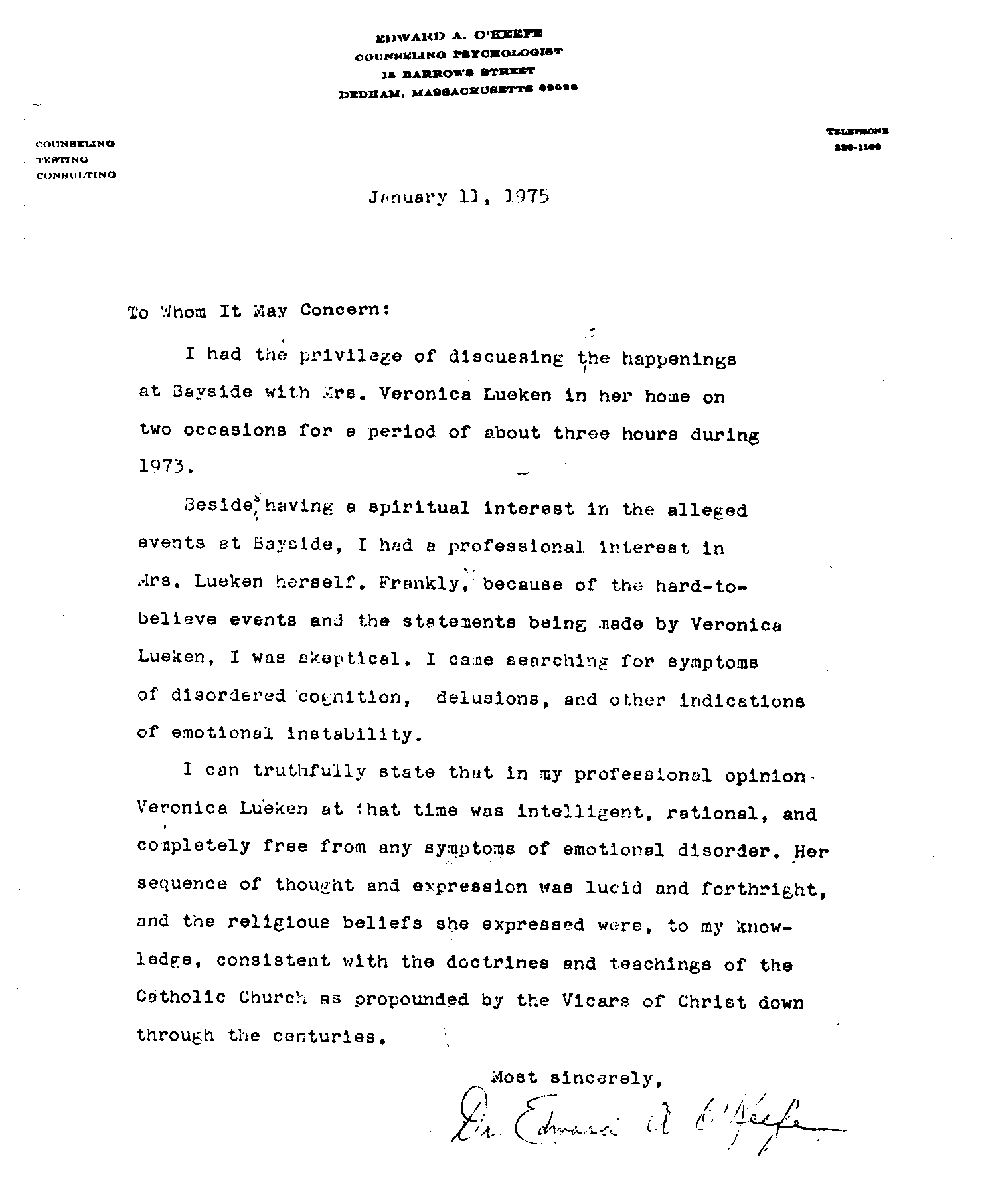 Letter of Dr. Edward O'Keefe regarding Veronica Lueken