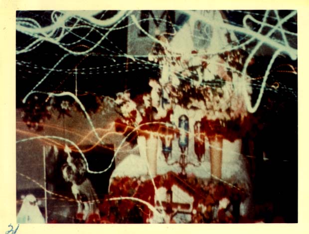 Photo taken of the lower section of Our Lady of the Roses Shrine statue and the pedestal. You see present the candles, the roses which adorn Our Lady’s statue during the vigils. But you note, covering the whole photograph, are the Rosary-bead patterns miraculous appearing upon the photograph, symbolizing the many Rosaries being prayed by the pilgrims. During the vigils the people present continuously recite aloud Our Lady’s most holy Rosary. This amounts to seven 5-decade Rosaries recited during each and every vigil. The vigils are vigils of prayer, reparation and atonement.